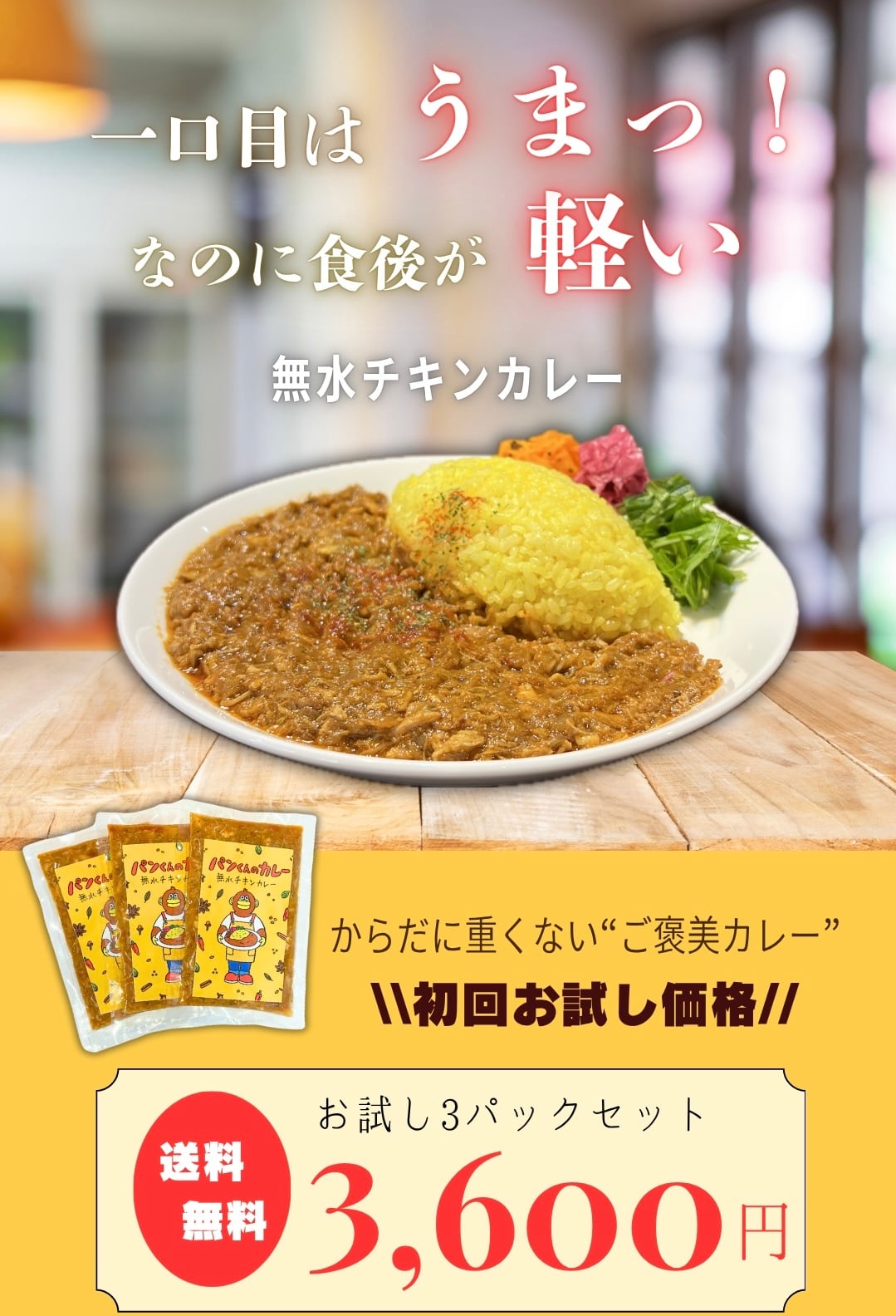 【無水チキンカレー】【3パックセット】【送料無料】 ⚫︎辛さ無し(お子様でも食べられます) ⚫︎200gパック×3 ⚫︎原材料 ブラジル産鶏モモ肉、トマト、玉ねぎ、にんにく、生姜、スパイス、塩 ⚫︎賞味期限 冷凍で約3ヶ月 ⚫︎調理方法 沸騰したお湯で5〜6分 ⚫︎グルテンフリー ⚫︎化学調味料無添加 ⚫︎保存料・着色料不使用 ▼送料▼ 送料無料/ クール宅急便 ※お届け日時指定が出来ます。 ▼発送について▼ ※九州など地域によっては最短翌日にお届け可能です。 その他の地域も2〜4日以内にお届けします。 ご注文時の混雑状況、休業日、配送時の交通事情や天候状況 及び離島、一部地域への配送の場合はご希望に添えない場合があります。