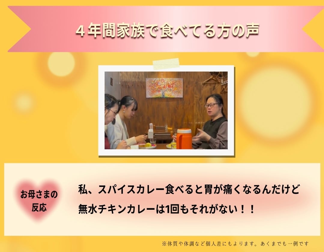 【無水チキンカレー】【1パック】【送料別/全国一律1000円】 ⚫︎辛さ無し(お子様でも食べられます) ⚫︎200gパック×1 ⚫︎原材料 ブラジル産鶏モモ肉、トマト、玉ねぎ、にんにく、生姜、スパイス、塩 ⚫︎賞味期限 冷凍で約3ヶ月 ⚫︎調理方法 沸騰したお湯で5〜6分 ⚫︎グルテンフリー ⚫︎化学調味料無添加 ⚫︎保存料・着色料不使用 ▼送料▼ 送料別全国一律1000円 ※お届け日時指定が出来ます。 ▼発送について▼ ※九州など地域によっては最短翌日にお届け可能です。 その他の地域も2〜4日以内にお届けします。 ご注文時の混雑状況、休業日、配送時の交通事情や天候状況 及び離島、一部地域への配送の場合はご希望に添えない場合があります。